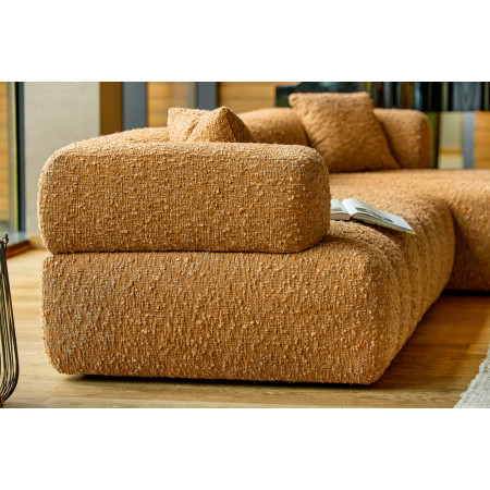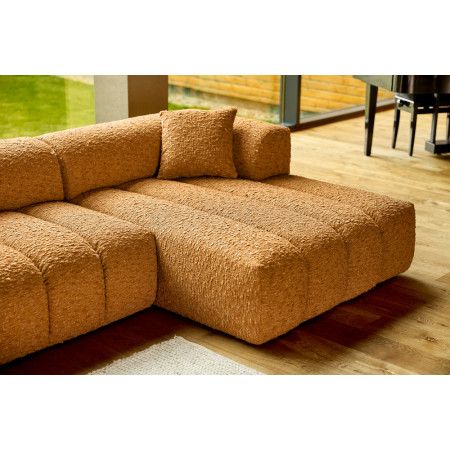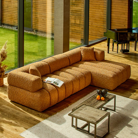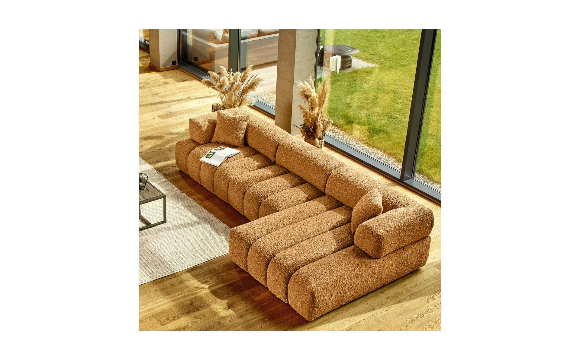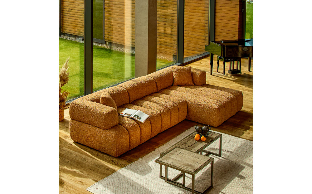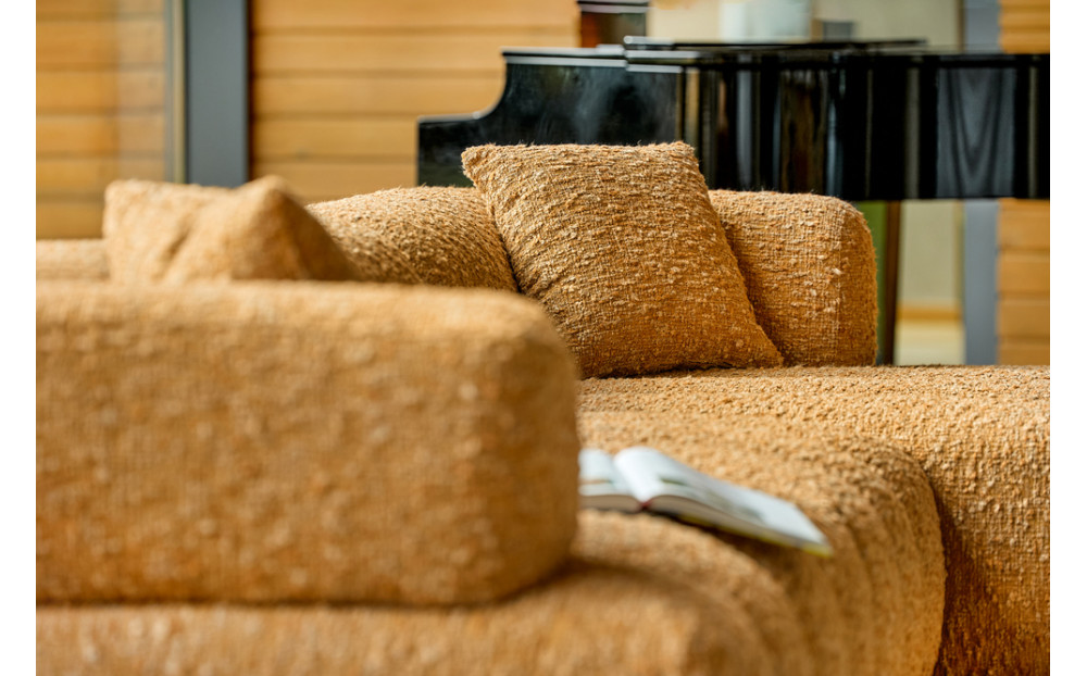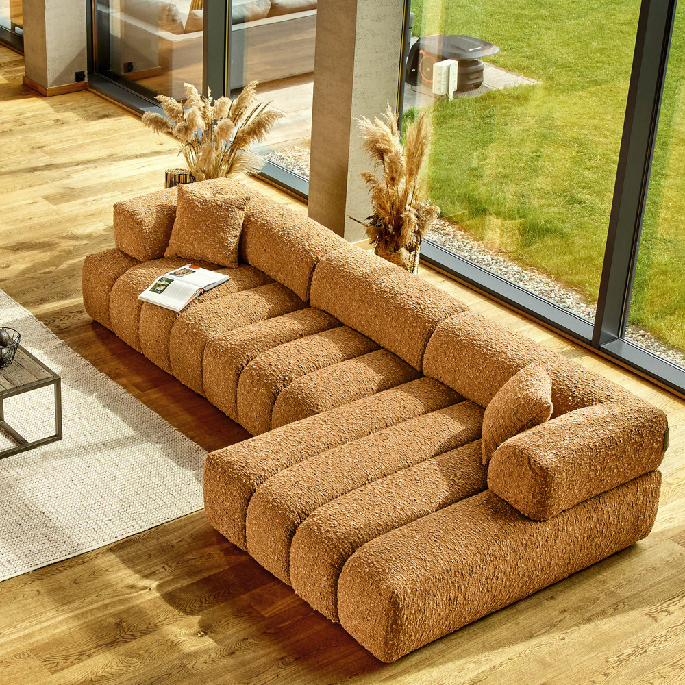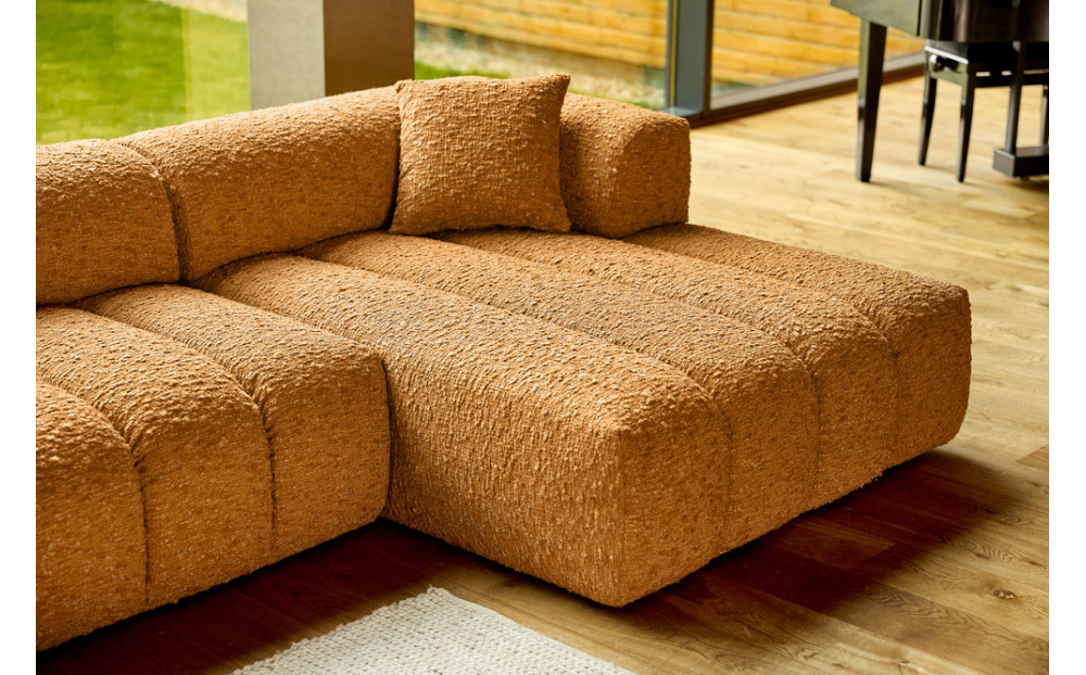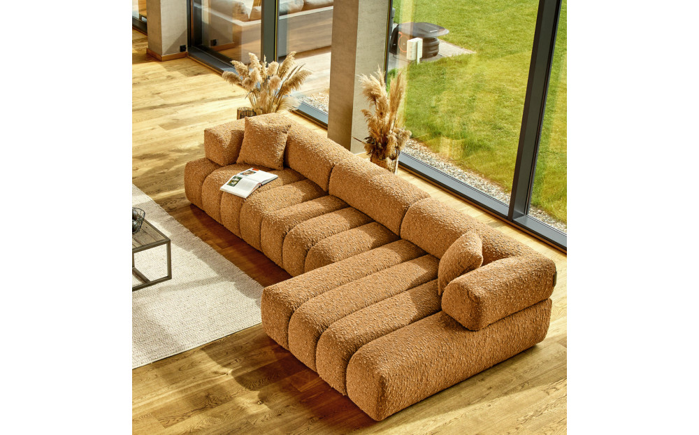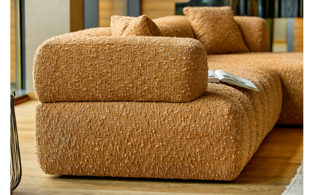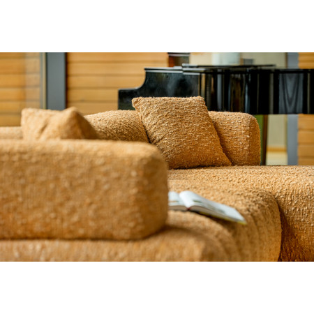 PADDINGTON – wyjątkowa sofia modułowa z ekskluzywnej linii Golden Ribbon. Jej rzucająca się w oczy, rzeźbiarska forma z charakterystycznymi pionowymi przeszyciami, obleczona w fakturę tkaniny Plateu 01, natychmiast przyciąga wzrok, ustanawiając standard nowoczesnej estetyki.