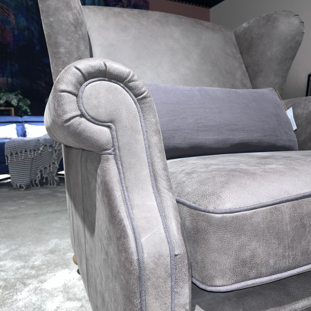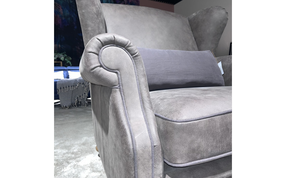 Korpus fotela wykonano z naturalnej skóry anilinowej, która zachwyca swoją miękkością oraz autentycznym wyglądem, widoczne subtelne niuanse i struktura skóry podkreślają jej szlachetność. Całość wykończono ozdobną lamówką, dodającą elegancji i podkreślającą staranność wykonania.